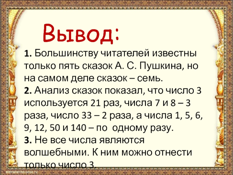 Вывод:1. Большинству читателей известны только пять сказок А. С. Пушкина, но на самом деле сказок – семь.2.