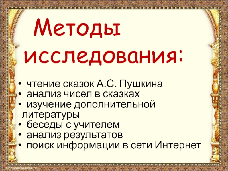 Методы  исследования:   чтение сказок А.С. Пушкина анализ чисел в сказках изучение дополнительной литературы