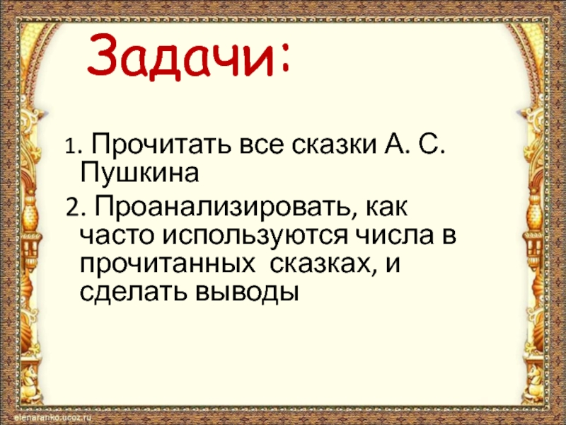 Задачи: 1. Прочитать все сказки А. С. Пушкина 2. Проанализировать, как часто используются числа в прочитанных сказках,