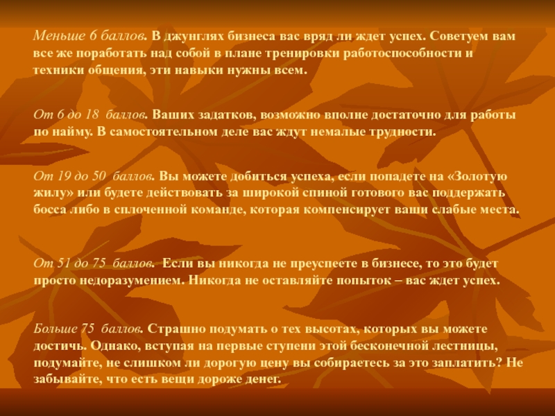 От 6 до 18 баллов. Ваших задатков, возможно вполне достаточно для работы по найму. В самостоятельном деле вас ждут немалые трудности.