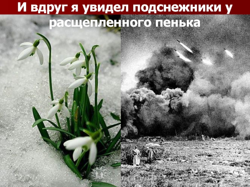 Слайд 9И вдруг я увидел подснежники у расщепленного пенька