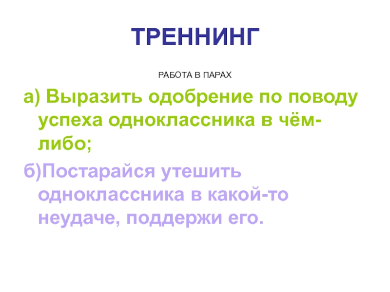 ТРЕННИНГРАБОТА В ПАРАХа) Выразить одобрение по поводу успеха одноклассника в чём-либо;б)Постарайся утешить одноклассника в какой-то неудаче, поддержи