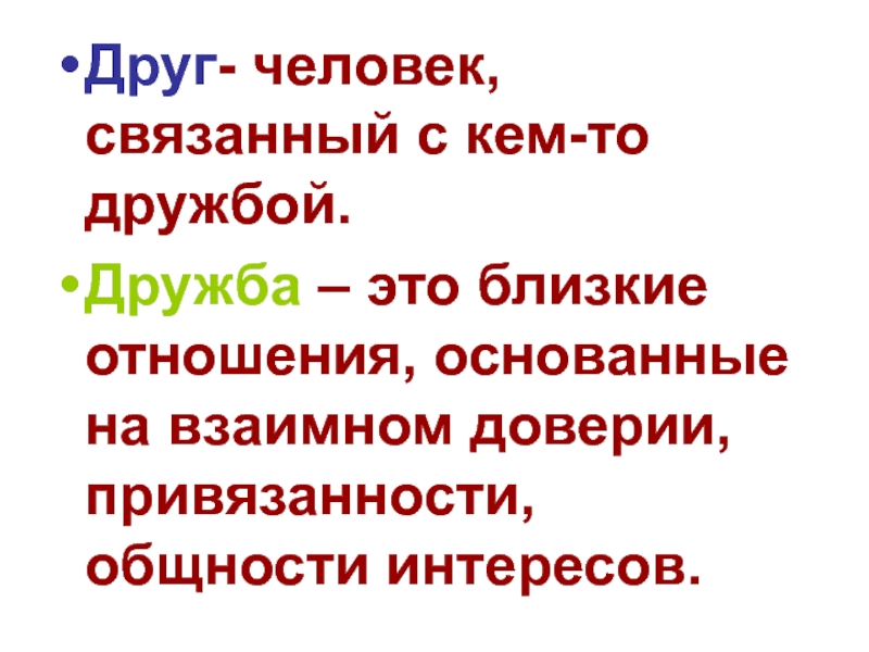 Друг- человек, связанный с кем-то дружбой.Дружба – это близкие отношения, основанные на взаимном доверии, привязанности, общности интересов.