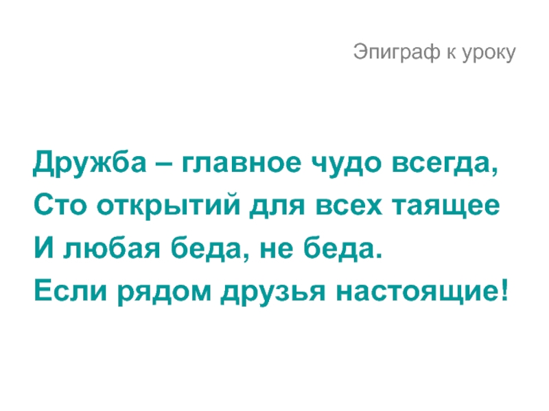 Эпиграф к урокуДружба – главное чудо всегда, Сто открытий для всех таящееИ любая беда, не беда.Если рядом