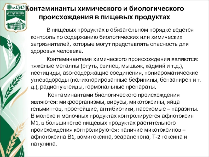 Контаминантами биологического происхождения являются: микроорганизмы, вирусы, микотоксины, яйца гельминтов, простейшие, антибиотики, насекомые – паразиты. В молоке и молочных продуктах контролируется афлотоксин М1, в большинстве пищевых продуктах растительного происхождения контролируются: наличие микотоксинов – афлотоксина В1, вомитоксина, зеараленона, Т-2 токсина и патулина.