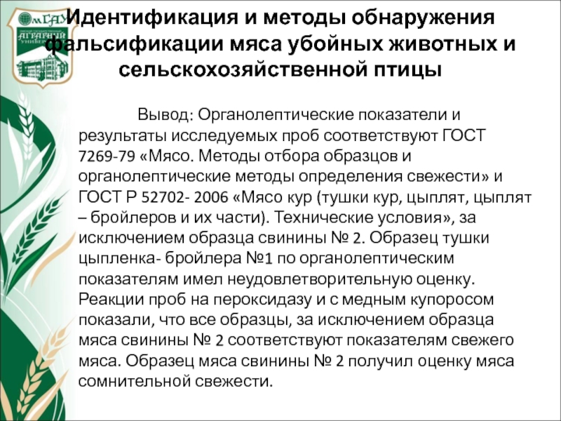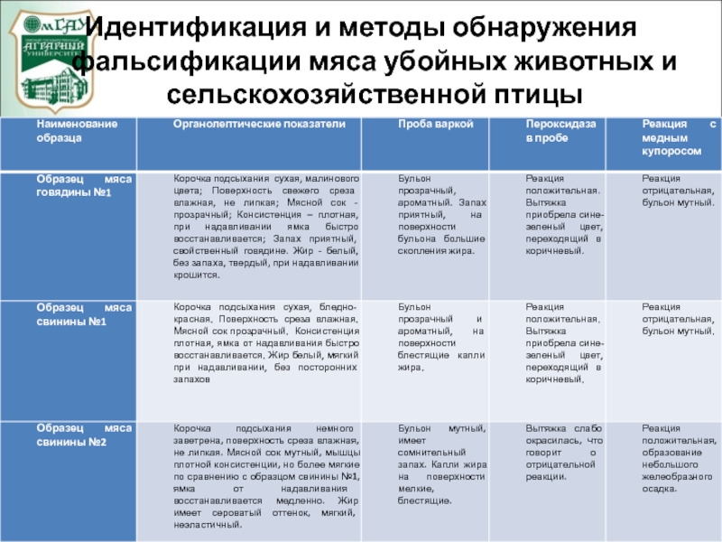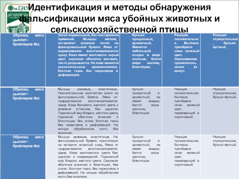 Слайд 17Идентификация и методы обнаружения фальсификации мяса убойных животных и сельскохозяйственной