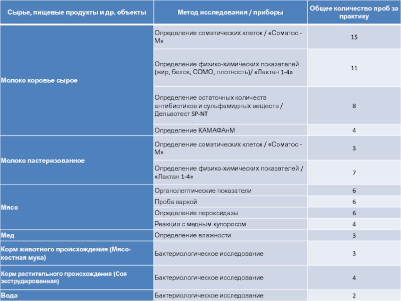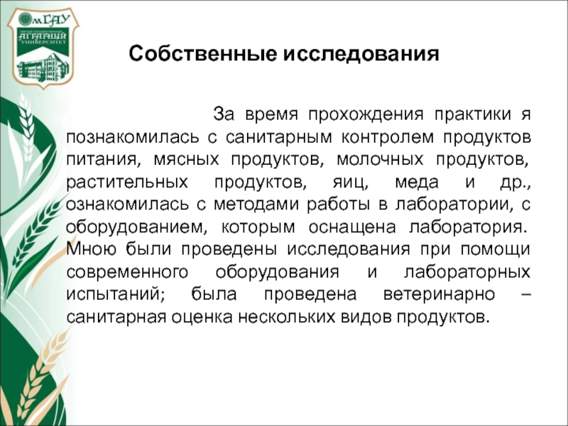 мясных продуктов, молочных продуктов, растительных продуктов, яиц, меда и др., ознакомилась с методами работы в лаборатории, с оборудованием, которым оснащена лаборатория. Мною были проведены исследования при помощи современного оборудования и лабораторных испытаний; была проведена ветеринарно – санитарная оценка нескольких видов продуктов.