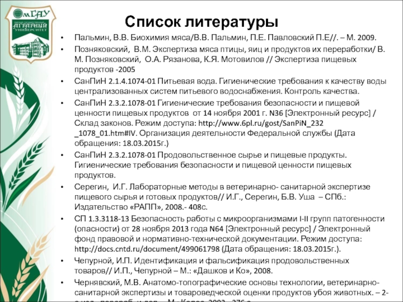 Серегин, И.Г. Лабораторные методы в ветеринарно- санитарной экспертизе пищевого сырья и готовых продуктов// И.Г., Серегин, Б.В. Уша – СПб.: Издательство «РАПП», 2008.- 408с.