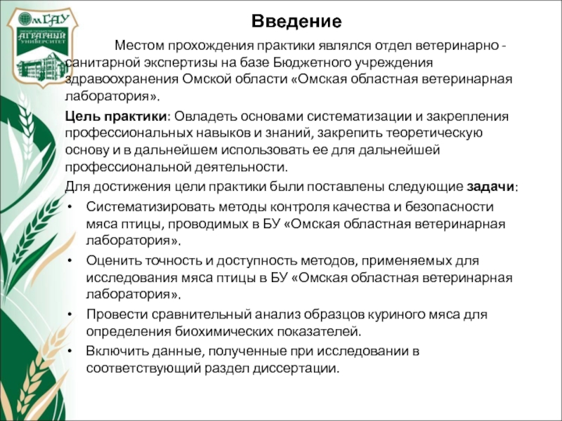 Оценить точность и доступность методов, применяемых для исследования мяса птицы в БУ «Омская областная ветеринарная лаборатория».