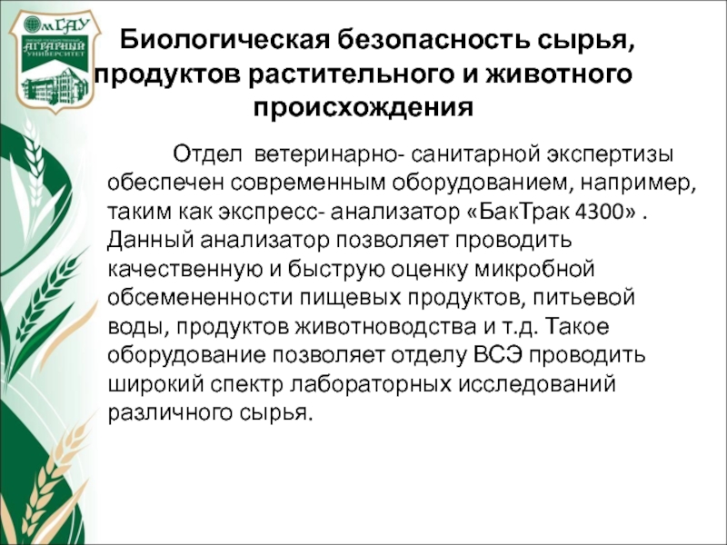 Слайд 9 Биологическая безопасность сырья, продуктов растительного и животного