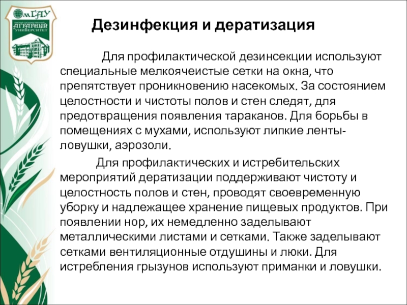 препятствует проникновению насекомых. За состоянием целостности и чистоты полов и стен следят, для предотвращения появления тараканов. Для борьбы в помещениях с мухами, используют липкие ленты- ловушки, аэрозоли.