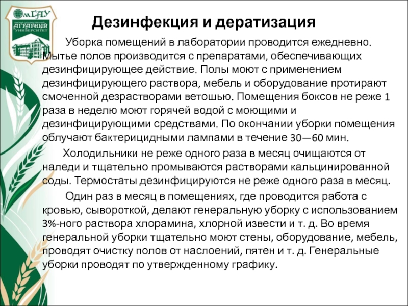 лаборатории проводится ежедневно. Мытье полов производится с препаратами, обеспечивающих дезинфицирующее