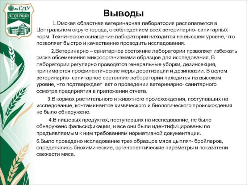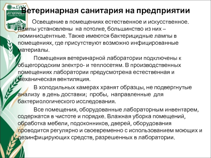 2.Ветеринарно – санитарное состояние лаборатории позволяет избежать риска обсеменения микроорганизмами образцов для исследования. В лаборатории регулярно проводятся генеральные уборки, дезинсекция, принимаются профилактические меры дератизации и дезинвазии. В целом ветеринарно- санитарное состояние лаборатории находится на высоком уровне, что подтверждает акт о проведении ветеринарно- санитарного осмотра предприятия в приложении отчета.