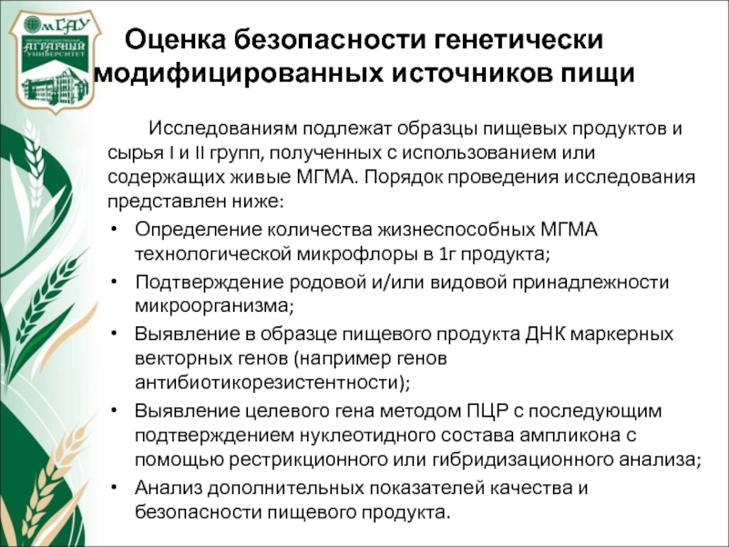 Слайд 14Оценка безопасности генетически модифицированных источников пищи