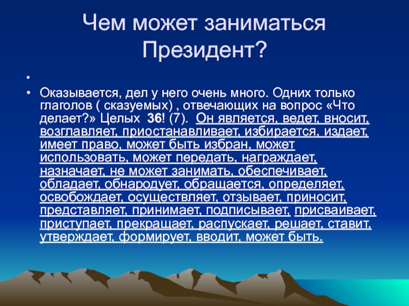 делает?» Целых 36! (7). Он является, ведет, вносит, возглавляет, приостанавливает, избирается, издает, имеет право, может быть избран, может использовать, может передать, награждает, назначает, не может занимать, обеспечивает, обладает, обнародует, обращается, определяет, освобождает, осуществляет, отзывает, приносит, представляет, принимает, подписывает, присваивает, приступает, прекращает, распускает, решает, ставит, утверждает, формирует, вводит, может быть.