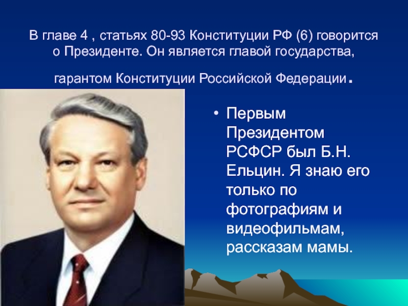 Первым Президентом РСФСР был Б.Н.Ельцин. Я знаю его только по фотографиям и видеофильмам, рассказам мамы.