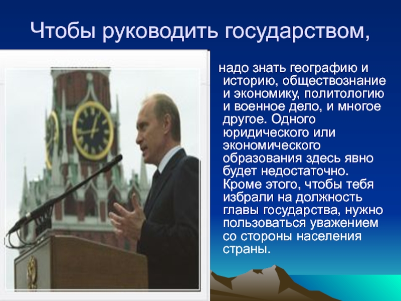 многое другое. Одного юридического или экономического образования здесь явно будет недостаточно. Кроме этого, чтобы тебя избрали на должность главы государства, нужно пользоваться уважением со стороны населения страны.