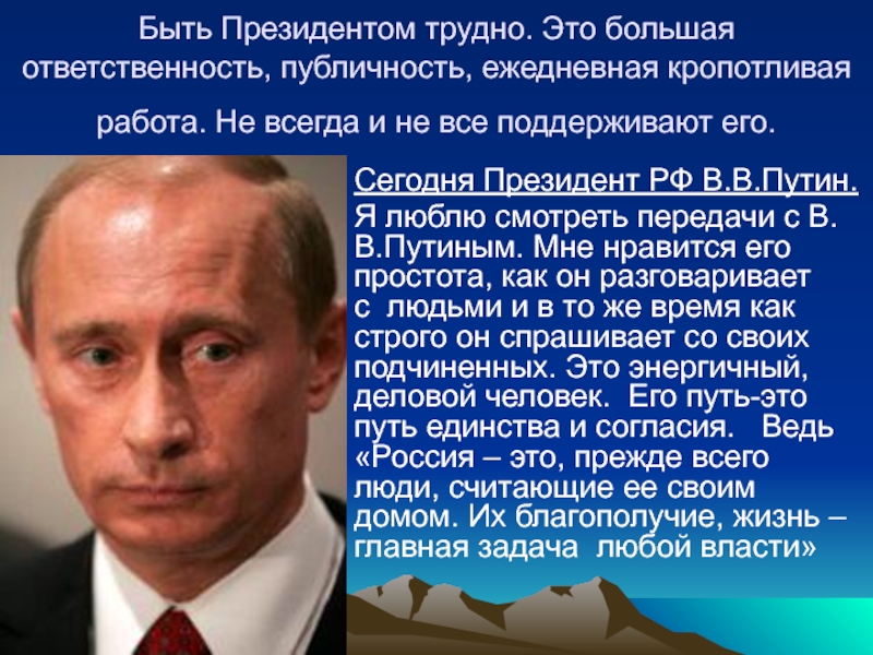 Я люблю смотреть передачи с В.В.Путиным. Мне нравится его простота, как он разговаривает с людьми и в то же время как строго он спрашивает со своих подчиненных. Это энергичный, деловой человек. Его путь-это путь единства и согласия. Ведь «Россия – это, прежде всего люди, считающие ее своим домом. Их благополучие, жизнь – главная задача любой власти»