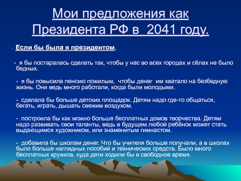 Слайд 31Мои предложения как Президента РФ в 2041 году.