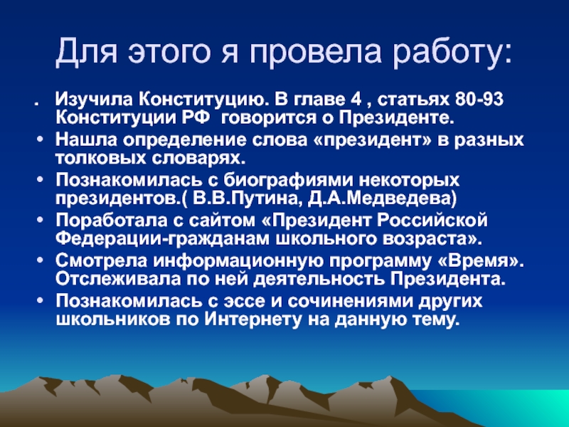Познакомилась с биографиями некоторых президентов.( В.В.Путина, Д.А.Медведева)