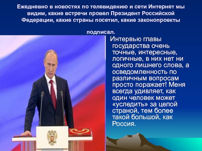Интервью главы государства очень точные, интересные, логичные, в них нет ни одного лишнего слова, а осведомленность по различным вопросам просто поражает! Меня всегда удивляет, как один человек может «уследить» за целой страной, тем более такой большой, как Россия.