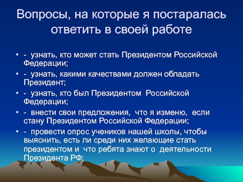 - провести опрос учеников нашей школы, чтобы выяснить, есть ли среди них желающие стать президентом и что ребята знают о деятельности Президента РФ;