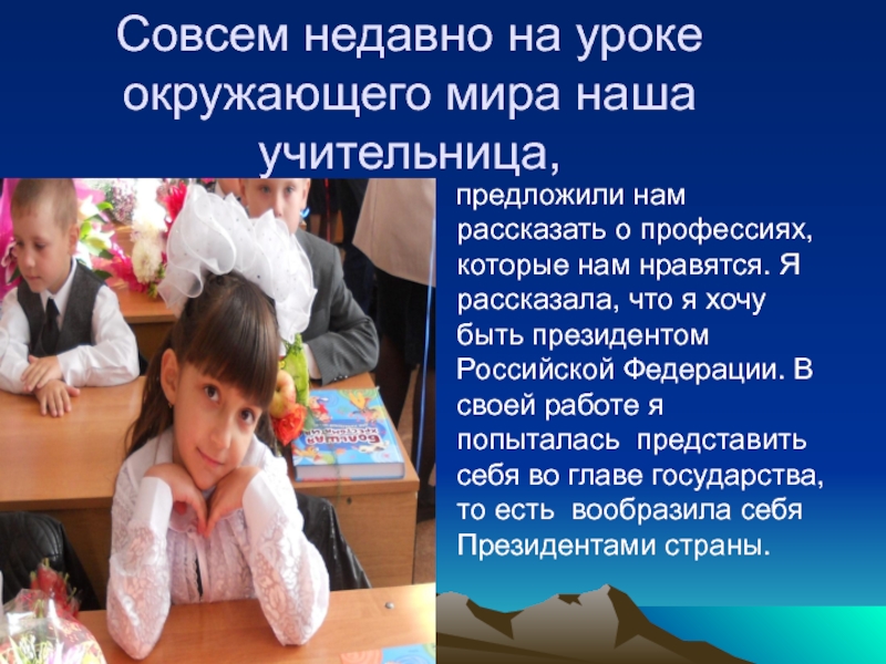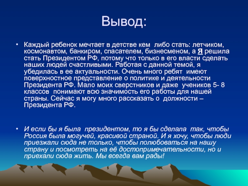 я хочу быть президентом Российской Федерации. В своей работе я попыталась представить себя во главе государства, то есть вообразила себя Президентами страны.