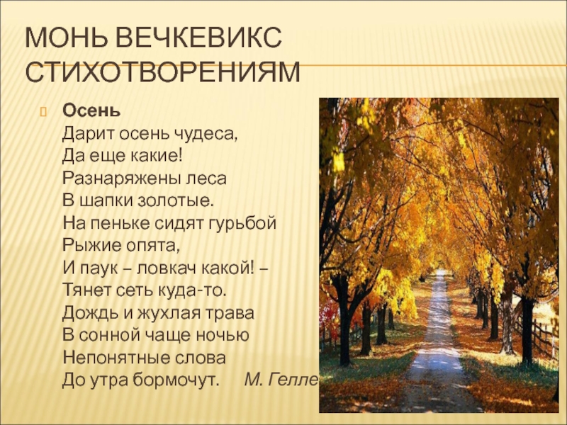 МОНЬ ВЕЧКЕВИКС СТИХОТВОРЕНИЯМОсень Дарит осень чудеса, Да еще какие! Разнаряжены леса В шапки золотые. На пеньке сидят