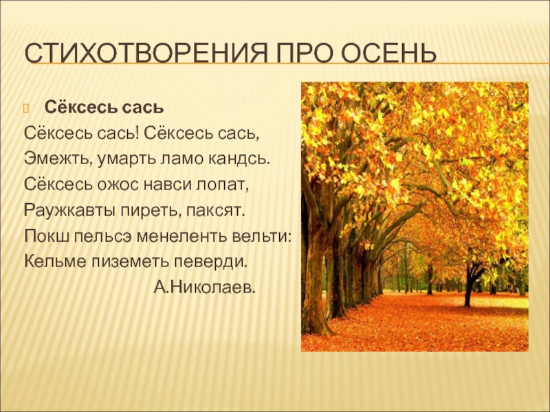 СТИХОТВОРЕНИЯ ПРО ОСЕНЬСёксесь сасьСёксесь сась! Сёксесь сась,Эмежть, умарть ламо кандсь.Сёксесь ожос навси лопат,Раужкавты пиреть, паксят.Покш пельсэ менеленть вельти:Кельме пиземеть певерди.