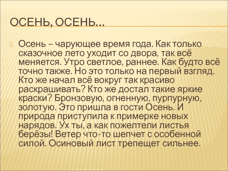 будто всё точно также. Но это только на первый взгляд. Кто же начал всё вокруг так красиво раскрашивать? Кто же достал такие яркие краски? Бронзовую, огненную, пурпурную, золотую. Это пришла в гости Осень. И природа приступила к примерке новых нарядов. Ух ты, а как пожелтели листья берёзы! Ветер что-то шепчет с особенной силой. Осиновый лист трепещет сильнее.