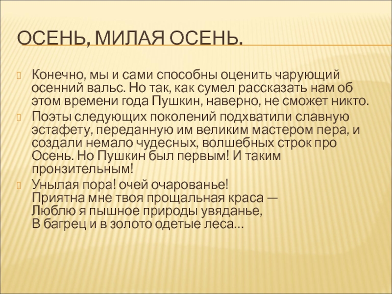 Поэты следующих поколений подхватили славную эстафету, переданную им великим мастером пера, и создали немало чудесных, волшебных строк про Осень. Но Пушкин был первым! И таким пронзительным!
