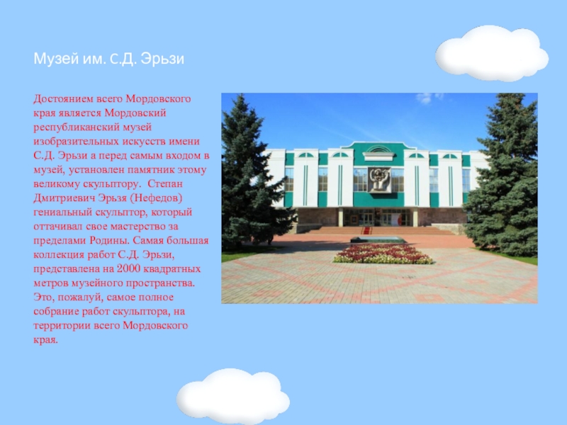 Музей им. C.Д. Эрьзи Достоянием всего Мордовского края является Мордовский республиканский музей изобразительных искусств имени С.Д. Эрьзи