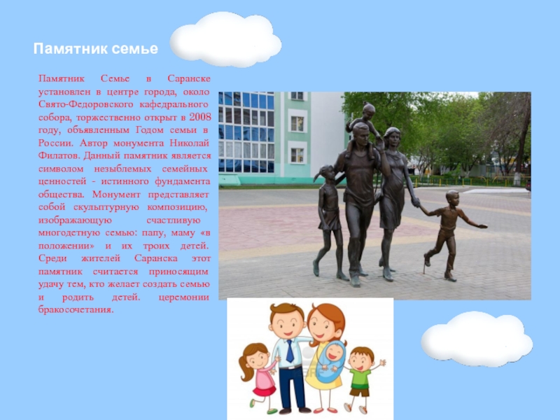 семьи в России. Автор монумента Николай Филатов. Данный памятник является символом незыблемых семейных ценностей - истинного фундамента общества. Монумент представляет собой скульптурную композицию, изображающую счастливую многодетную семью: папу, маму «в положении» и их троих детей.  Среди жителей Саранска этот памятник считается приносящим удачу тем, кто желает создать семью и родить детей. церемонии бракосочетания.