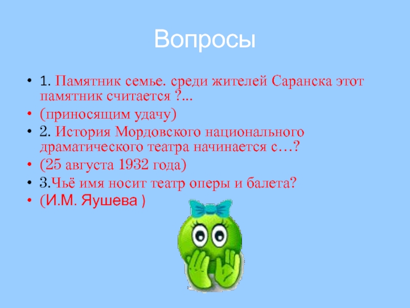 Вопросы1. Памятник семье. среди жителей Саранска этот памятник считается ?...(приносящим удачу)2. История Мордовского национального драматического театра начинается