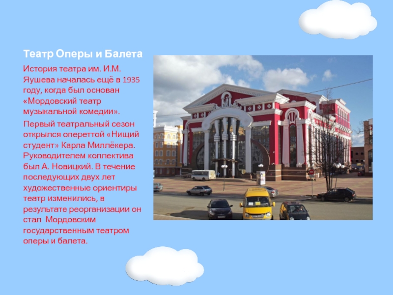 Театр Оперы и БалетаИстория театра им. И.М. Яушева началась ещё в 1935 году, когда был основан «Мордовский