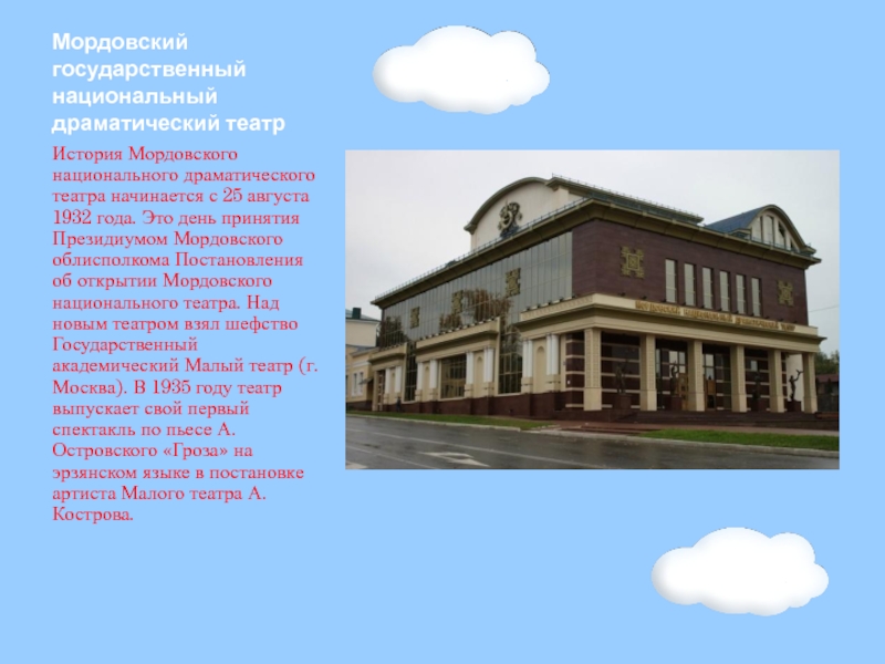 облисполкома Постановления об открытии Мордовского национального театра. Над новым театром взял шефство Государственный академический Малый театр (г.Москва). В 1935 году театр выпускает свой первый спектакль по пьесе А.Островского «Гроза» на эрзянском языке в постановке артиста Малого театра А. Кострова.