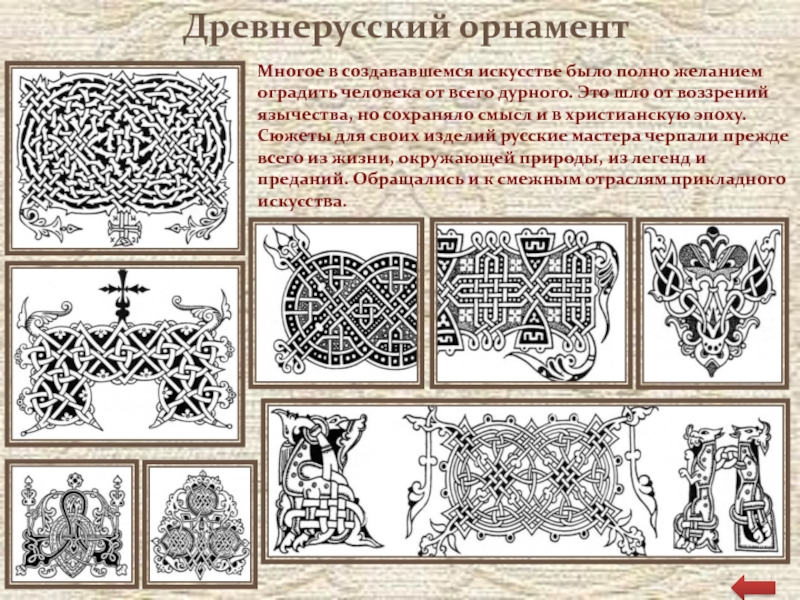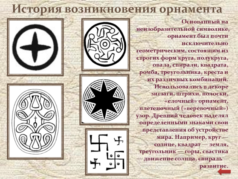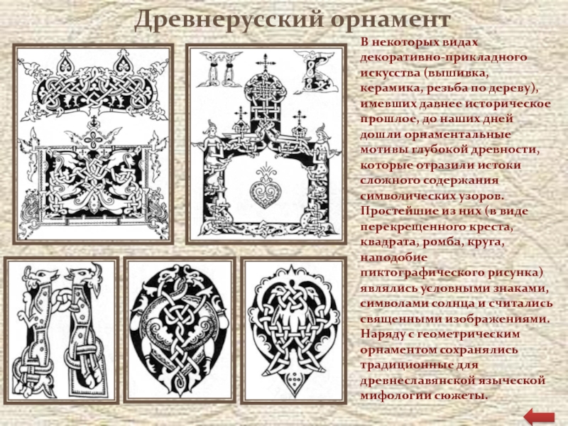 глубокой древности, которые отразили истоки сложного содержания символических узоров. Простейшие из них (в виде перекрещенного креста, квадрата, ромба, круга, наподобие пиктографического рисунка) являлись условными знаками, символами солнца и считались священными изображениями. Наряду с геометрическим орнаментом сохранялись традиционные для древнеславянской языческой мифологии сюжеты.