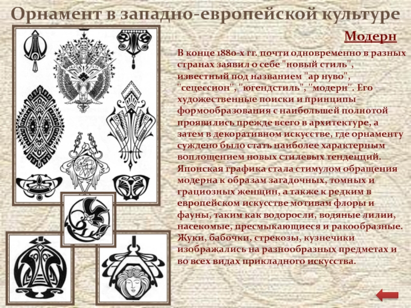 ''ар нуво'', ''сецессион'', ''югендстиль'', ''модерн''. Его художественные поиски и принципы формообразования с наибольшей полнотой проявились прежде всего в архитектуре, а затем в декоративном искусстве, где орнаменту суждено было стать наиболее характерным воплощением новых стилевых тенденций. Японская графика стала стимулом обращения модерна к образам загадочных, томных и грациозных женщин, а также к редким в европейском искусстве мотивам флоры и фауны, таким как водоросли, водяные лилии, насекомые, пресмыкающиеся и ракообразные. Жуки, бабочки, стрекозы, кузнечики изображались на разнообразных предметах и во всех видах прикладного искусства.