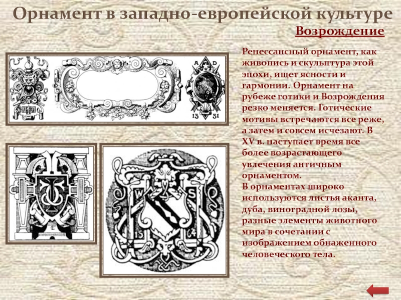 Возрождения резко меняется. Готические мотивы встречаются все реже, а затем и совсем исчезают. В XV в. наступает время все более возрастающего увлечения античным орнаментом.