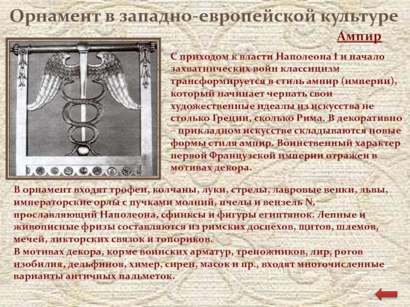 начинает черпать свои художественные идеалы из искусства не столько Греции, сколько Рима. В декоративно – прикладном искусстве складываются новые формы стиля ампир. Воинственный характер первой Французской империи отражен в мотивах декора.