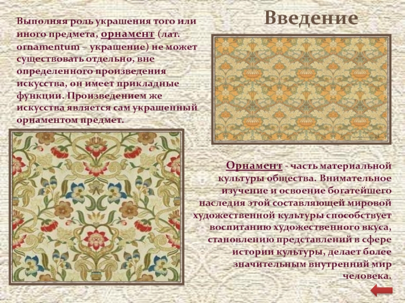 Орнамент - часть материальной культуры общества. Внимательное изучение и освоение богатейшего наследия этой составляющей мировой художественной культуры способствует воспитанию художественного вкуса, становлению представлений в сфере истории культуры, делает более значительным внутренний мир человека.
