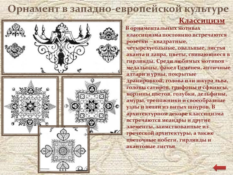 лавра, цветы, свивающиеся в гирлянды. Среди любимых мотивов – медальоны, факел Гименея, античные алтари и урны, покрытые драпировкой, голова или шкура льва, головы сатиров, грифоны и сфинксы, корзины цветов, голубки, дельфины, амуры, треножники и своеобразные узлы и петли из витых шнуров. В архитектурном декоре классицизма встречаются меандры и другие элементы, заимствованные из греческой архитектуры, а также цветочные побеги, гирлянды и акантовые листья.