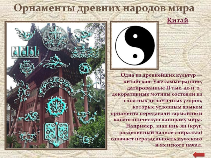 состояли из сложных динамичных узоров, которые условным языком орнамента передавали гармонию и космогоническую панораму мира. Например, знак инь-ян (круг, разделенный надвое спиралью) означает нераздельность мужского и женского начал.