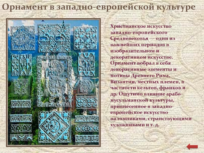 себя декоративные элементы и мотивы Древнего Рима, Византии, местных племен, в частности кельтов, франков и др. Ощутимо влияние арабо-мусульманской культуры, привнесенное в западно-европейское искусство паломниками, странствующими художниками и т. д.