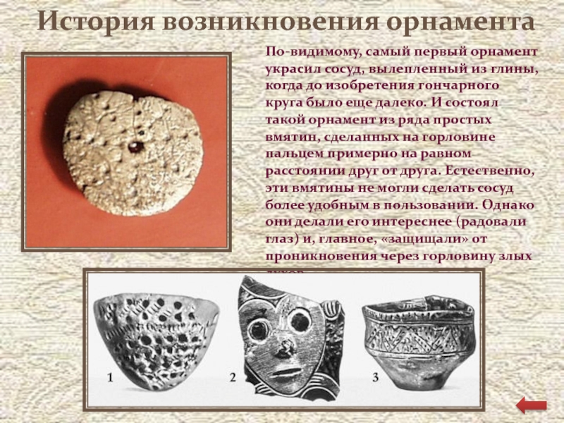 По-видимому, самый первый орнамент украсил сосуд, вылепленный из