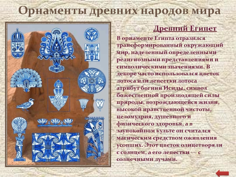 линейное расположение орнаментальных элементов представляло египетскую идею бесконечности жизни. Декорирование предметов имело и знаковый смысл. Орнамент читался как буквенный текст, потому что он был основан на использовании общепринятых символов