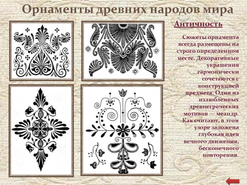 в орнаменте Древней Греции был ясно выявленный ритм, построенный на чередовании одинаковых элементов, на основе их равенства между собой. «Этот орнамент словно бы движется перед зрителем равномерно, постоянно, в ритме, исполненном поистине космического звучания. Он всегда замкнут в круг — круг бытия, — обегая фриз здания, тулово сосуда, четырехугольное поле ткани».