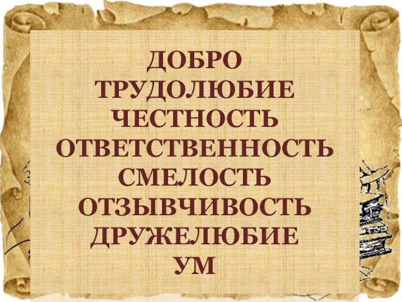 ДОБРОТРУДОЛЮБИЕЧЕСТНОСТЬОТВЕТСТВЕННОСТЬСМЕЛОСТЬОТЗЫВЧИВОСТЬДРУЖЕЛЮБИЕУМ