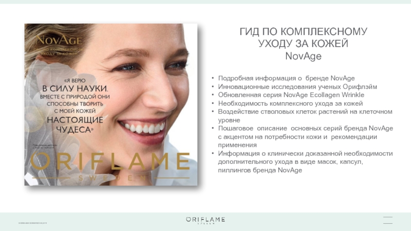 Все средства разрабатываются учеными Орифлэйм в собственном Институте исследования кожи в Стокгольме и Центре исследований и разработок в Дублине.