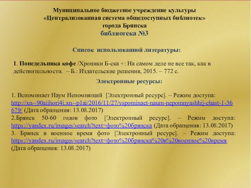 3. Брянск в военное время фото [Электронный ресурс]. – Режим доступа: https://yandex.ru/images/search?text=фото%20брянска%20в%20военное%20время (Дата обращения: 13.08.2017)